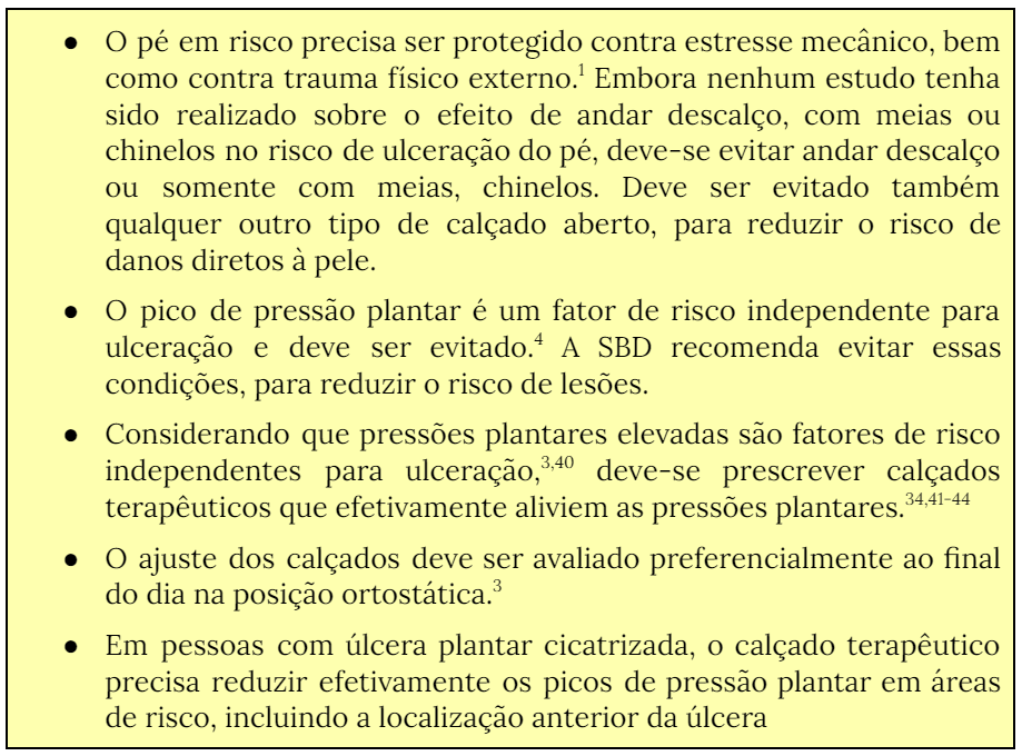 • Embora o número de estudos ainda seja reduzido, recomenda-se calçados que se ajustem, protejam e acomodem o formato de seus pés, com comprimento, largura e profundidade adequados.34