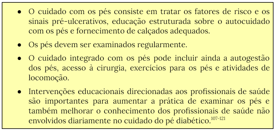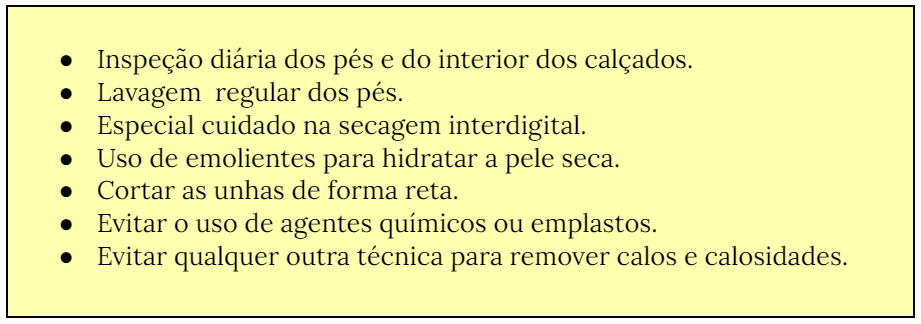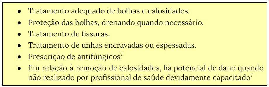 Embora não existam evidências diretas do impacto de intervenções de autocuidado na prevenção de úlceras nos pés, as medidas recomendadas permitem a detecção dos primeiros fatores de risco e contribuem para a higiene básica dos pés. As principais recomendações para exame e autocuidado com os pés estão descritas nos Quadros 4,5 e 6..