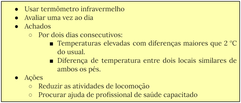 • O monitoramento doméstico da temperatura plantar dos pés deve ser feito uma vez por dia com um termômetro infravermelho, combinado com a ação preventiva subsequente. Quando temperaturas maiores que 2 oC forem observadas por dois dias consecutivos deve ser procurado auxílio especializado.2731
