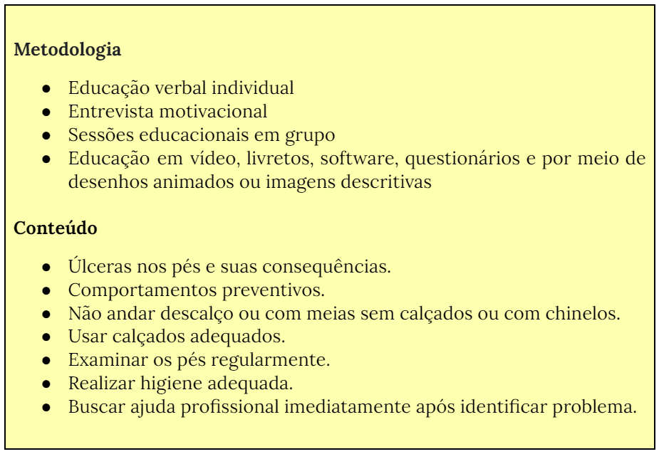 R4. Para pessoas com pé em risco 1 a 3, É RECOMENDADO fornecer educação estruturada sobre a autogestão de autocuidados do pé para a prevenção de ulceras (Quadro 5).