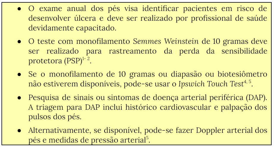 R1. Em pessoas com diabetes e risco muito baixo para ulceração (Categoria de risco 0) (ver Quadro 3, É RECOMENDADO a realização do exame anual dos pés (Quadro 4). O rastreio deve incluir o teste com o monofilamento de 10g (Semmes-Weinsten), (ou alternativamente o Ipswich Touch Test-IpTT) e o exame físico, procurando sinais de neuropatia periférica e doença arterial periférica.