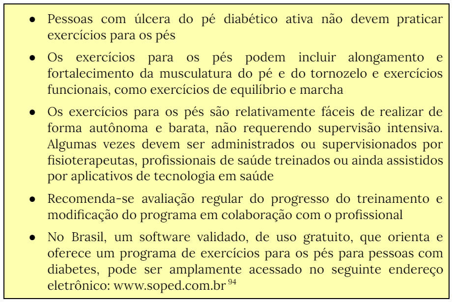 • Vários ECRs e estudos não-controlados8493 mostraram que diferentes formas de exercícios para os pés foram eficazes para melhorar fatores de risco modificáveis ​​para a úlcera do pé diabético, incluindo a redistribuição da pressão plantar, sintomas de neuropatia, déficits sensoriais, amplitude de movimento e força das articulações do complexo pé-tornozelo.