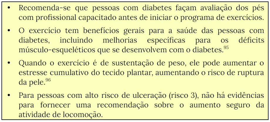 • Outro ensaio clínico pequeno de 12 semanas randomizou 29 pessoas com DM e polineuropatia, obesos para exercicios com (n=15) e sem (n=14) sustentação de peso. O grupo com sustentação de peso incluia caminhadas e ficar em pé 3x por semana. O grupo sem sustentação de peso fez exercicios aeróbicos sentado ou deitado pelo mesmo periodo. O desfecho foi o número de passos em teste de caminhada de 6 minutos. O número de úlceras não foi diferente entre os grupos. Um total de 4 úlceras surgiram em 3 participantes, sendo 1 no grupo de exercicio com sustentação de peso e 3 no grupo de exercícios sem sustentação de peso. Um total de 13 lesões nos pés surgiram em 12 participantes, sendo 7 no grupo com sustentação de peso e 6 no grupo sem sustentação de peso.83