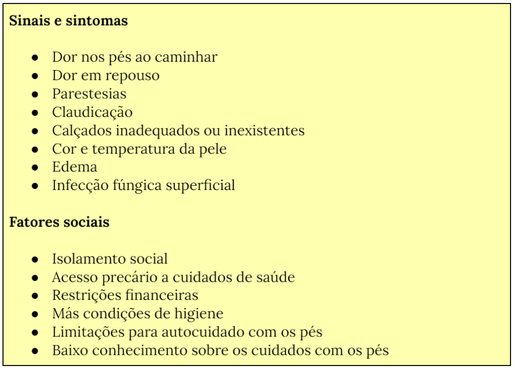 Os principais fatores de risco incluem a perda da sensibilidade tátil, vibratória e térmica, a presença de doença arterial periférica (DAP) e de deformidades nos pés (Quadro 1). A história prévia de ulceração e qualquer nível de amputação de membros inferiores aumenta ainda mais o risco de ulceração. Em geral, pessoas sem nenhum desses fatores presentes tem baixo risco para ulceração.