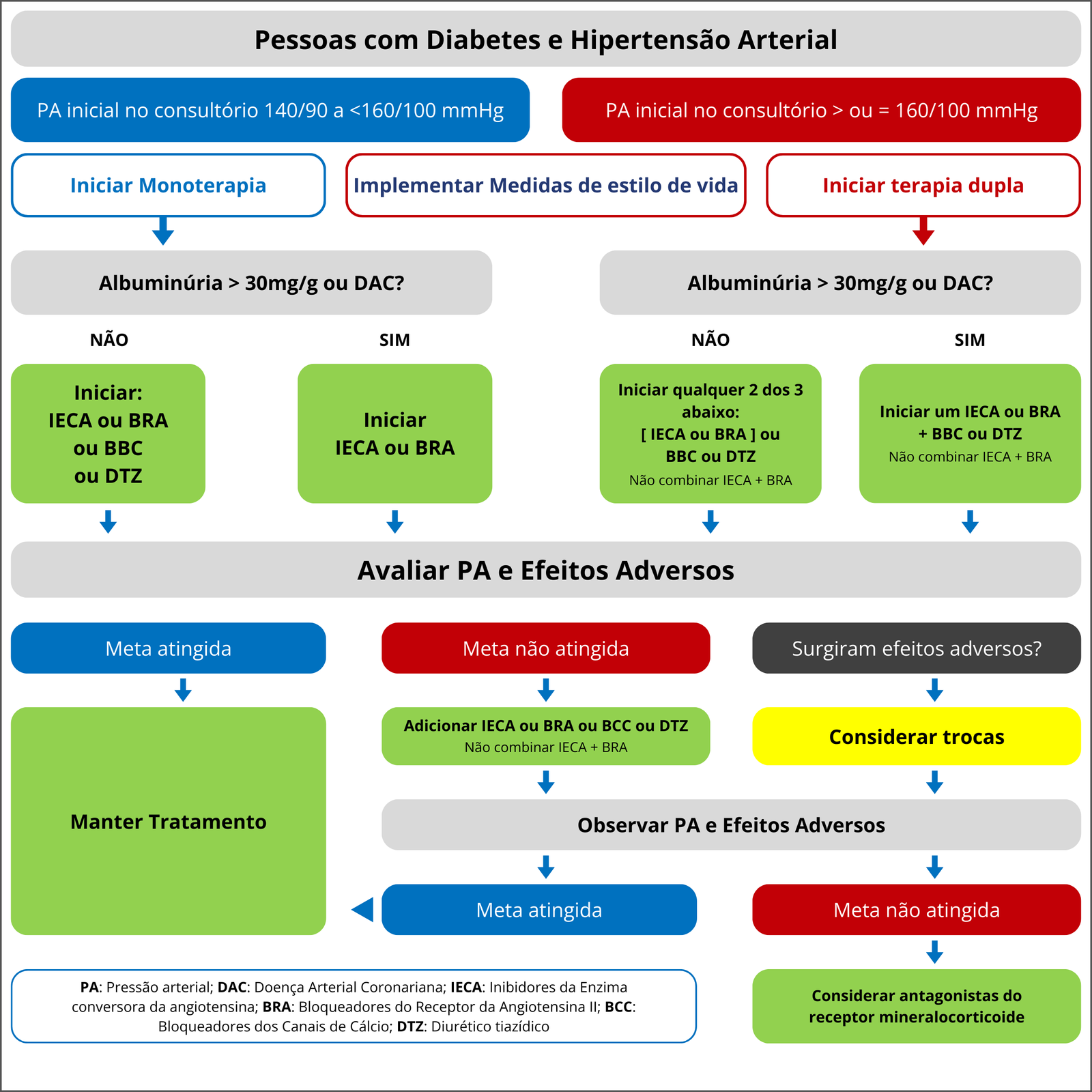 Siglas: PA: pressão arterial; PAS: pressão arterial sistólica; PAD: pressão arterial diastólica; IECA: inibidor da enzima conversora da angiotensina; BRA: bloqueador do receptor da angiotensina II; NAC: neuropatia autonômica cardiovascular. As medidas estão expressas em mmHg. A classificação é definida de acordo com a PA no consultório e pelo nível mais elevado de PAS ou PAD. A HA sistólica isolada é caracterizada por PAS ≥ 140 mmHg e PAD ≥ 90 mmHg. A HA diastólica isolada é caracterizada por PAS < 140 mmHg e PAD ≥ 90 mmHg. As recomendações para as pessoas com hipertensão arterial e diabetes levam em consideração os estágios de hipertensão, a idade, a presença de lesões em órgãos-alvo (LOA) e a presença de doença arterial coronária e doença renal crônica.12