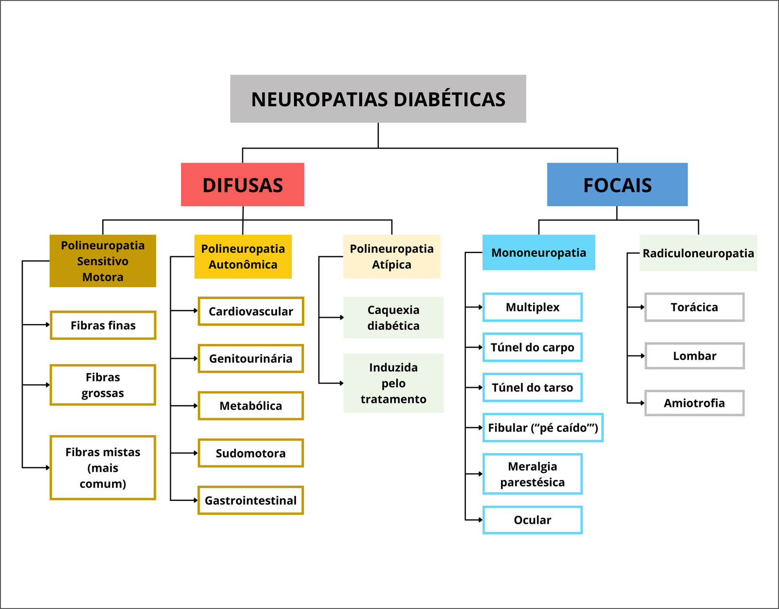Na literatura e nas diretrizes a seguir formuladas, o termo NPD é empregado como sinônimo de neuropatia sensitivo motora e/ou de polineuropatia diabética. A Figura 1 mostra a classificação atual das neuropatias diabéticas.