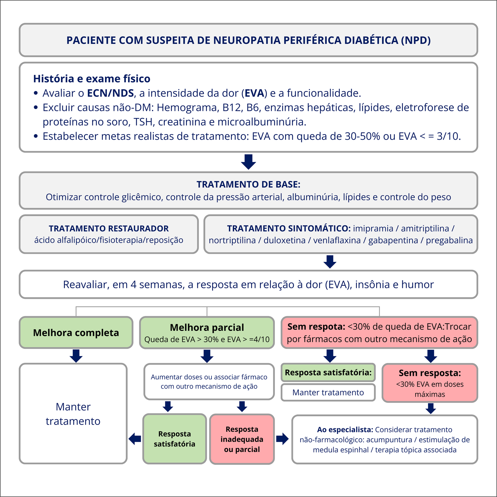 As neuropatias diabéticas (ND) constituem a complicação crônica mais prevalente, subdiagnosticada e subtratada do diabetes mellitus (DM). A neuropatia periférica diabética (NPD) é uma complicação precoce, polimórfica e furtiva1 em que, pelo menos, metade dos indivíduos permanece assintomática por muitos anos, enquanto a outra metade manifesta-se com dor neuropática aguda ou crônica (menos ou mais de 3 meses de evolução, respectivamente), reconhecida como neuropatia periférica diabética dolorosa (NPDD).2